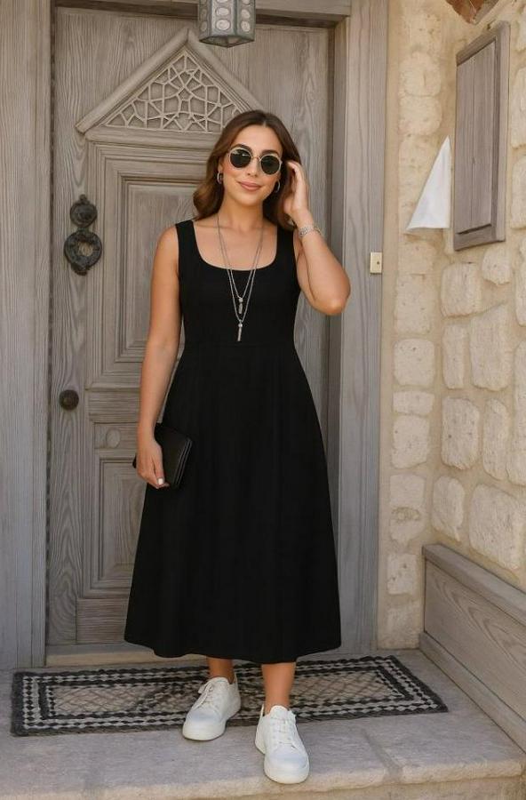 Kadın Askılı Geometrik Yakalı Geniş Kesim Detaylı Ithal Krep Elbise