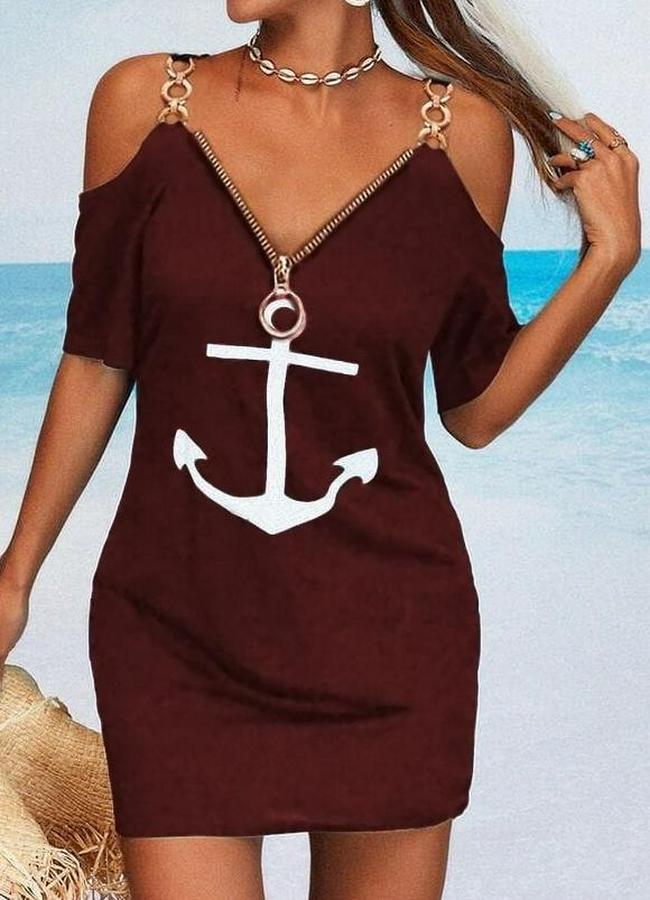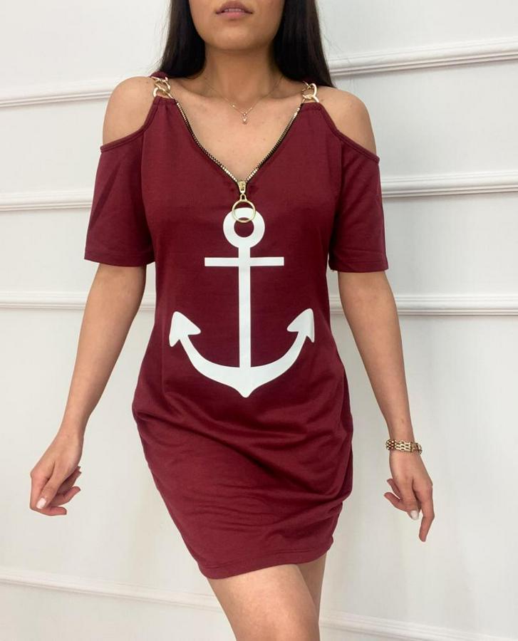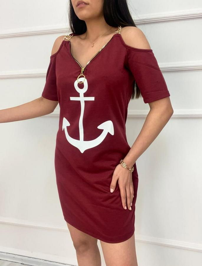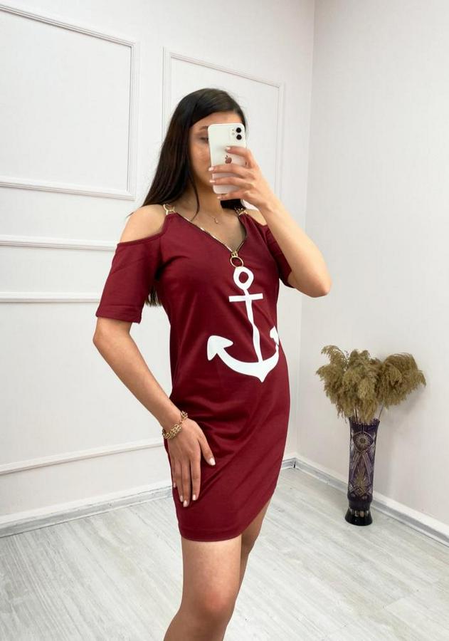 Fermuar Detay çıpa Baskılı Zincir Askılı Iki Iplik Elbise - Bordo