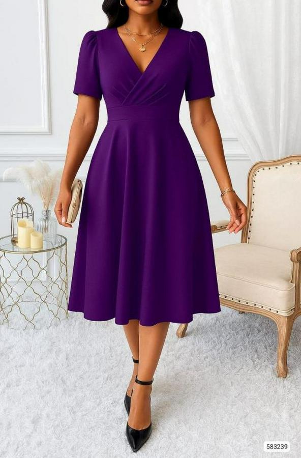 Kadın Kruvaze Yaka Kısa Kollu Midi Boy Krep Kumaş Elbise