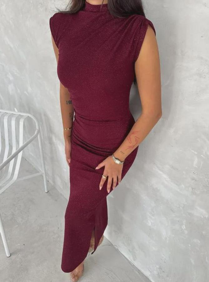 Likralı Simli Kumaş Yandan Yırtmaçlı Uzun Elbise Şık Kolsuz Abiye - Bordo