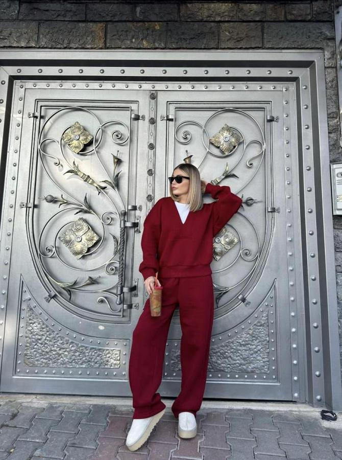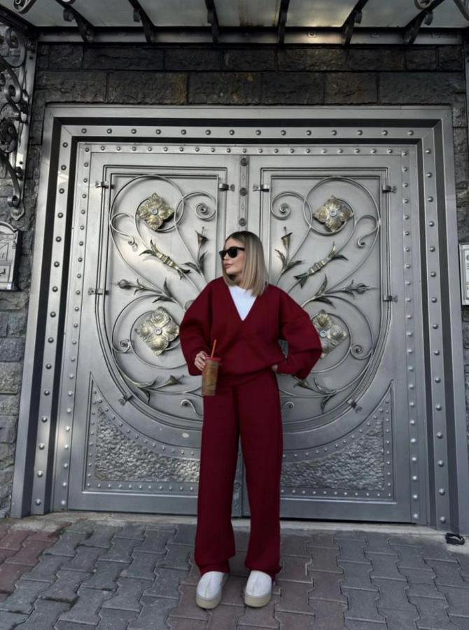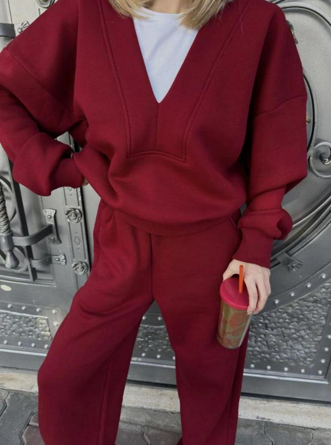 Geniş V Yaka Üç İplik Sweat Takım - Bordo