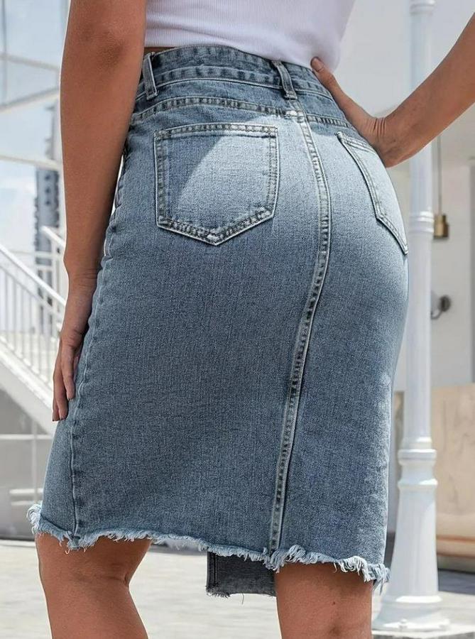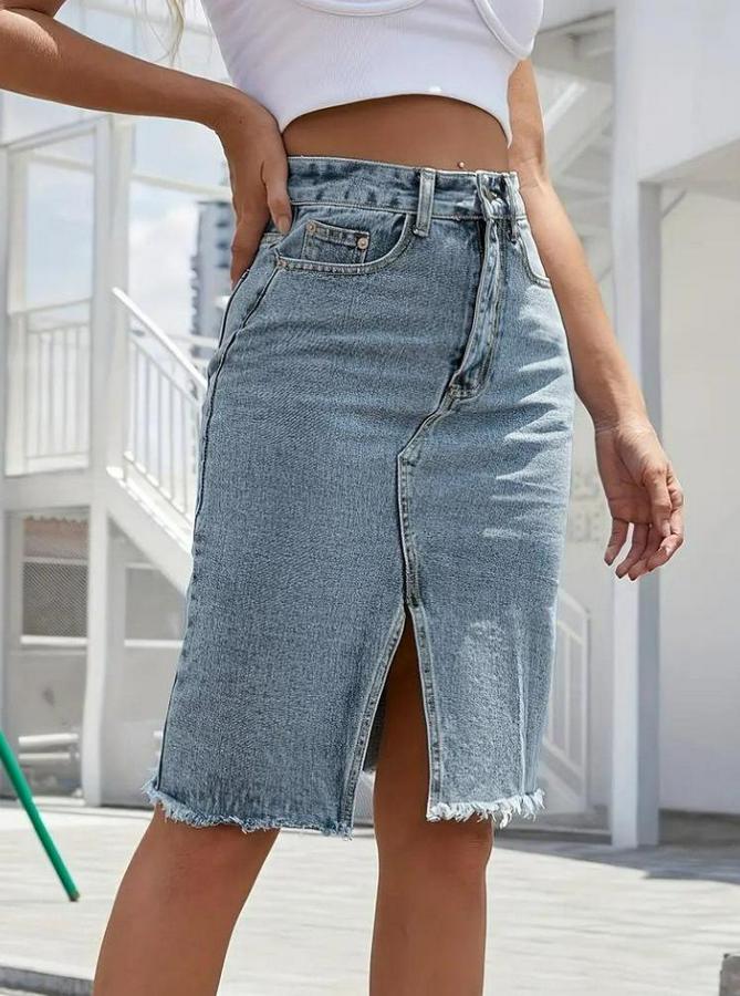 Kadın Elastik Bel Yırtık Kenar Detaylı Kot Etek
