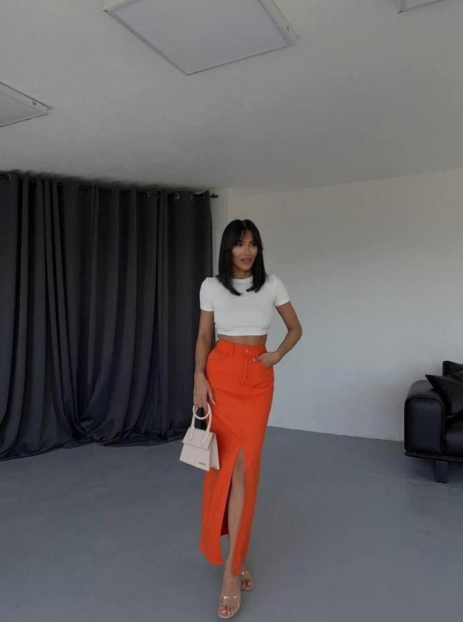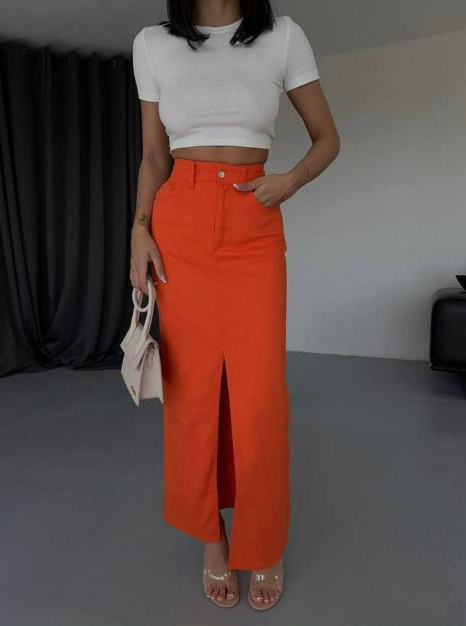 GABARDİN UZUN ÖNDEN YIRTMAÇLI ETEK - Turuncu