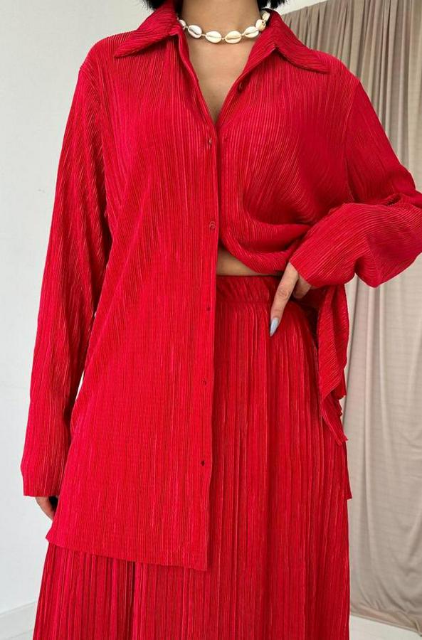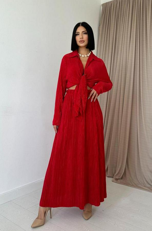 Kırmızı Fitilli Gömlek Ve Uzun Etek Takım