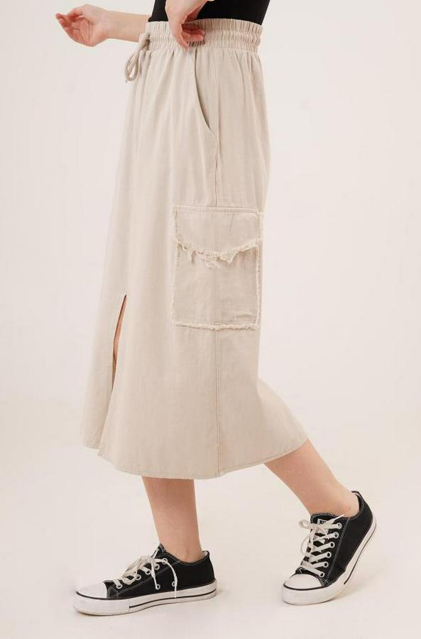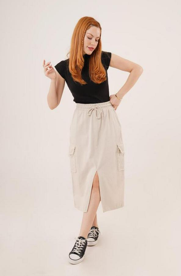 Ön Yırtmaçlı Cep Detaylı Krem Etek