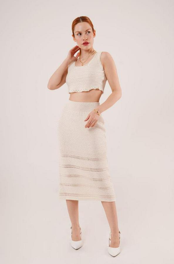 Örme Detaylı Etek Ve Bluz Krem Takım