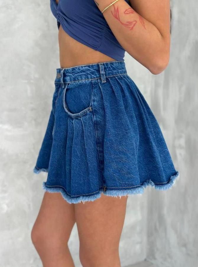 Şık Pileli Yazlık Mini Etekli Kot- Saks Mavisi