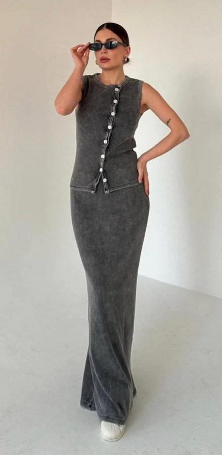 AnasayfaTüm ÜrünlerAlt GiyimEtekUzun Etekli Önü Düğmeli Badi Ikili Takım- Antrasit