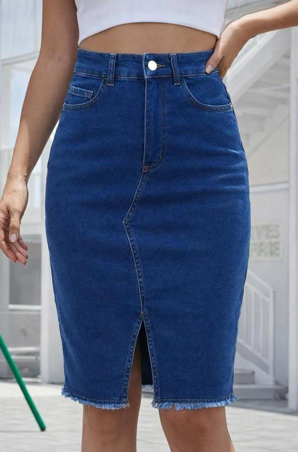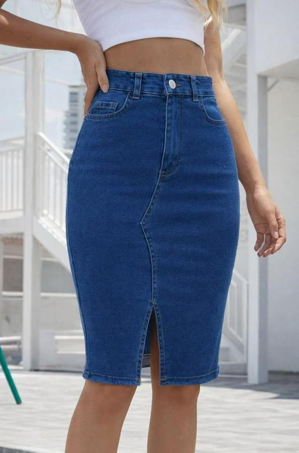 Yüksek Bel Önden Yırtmaçlı Kısa Kot Etek