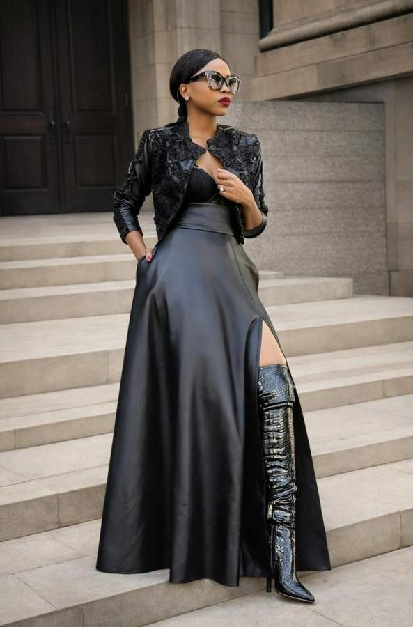 Yüksek Bel Uzun Yırtmaçlı Deri Etek