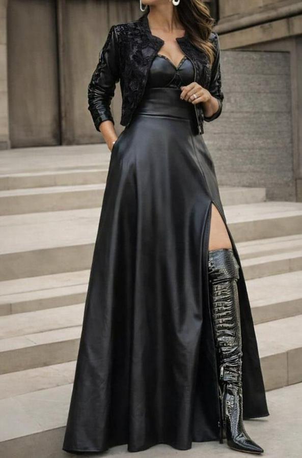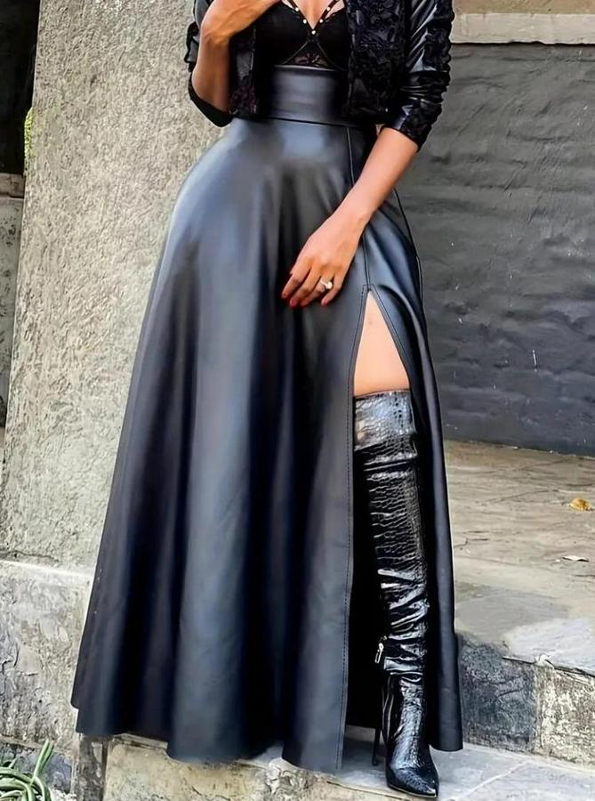 Kadın Yüksek Bel Uzun Yırtmaçlı Deri Etek