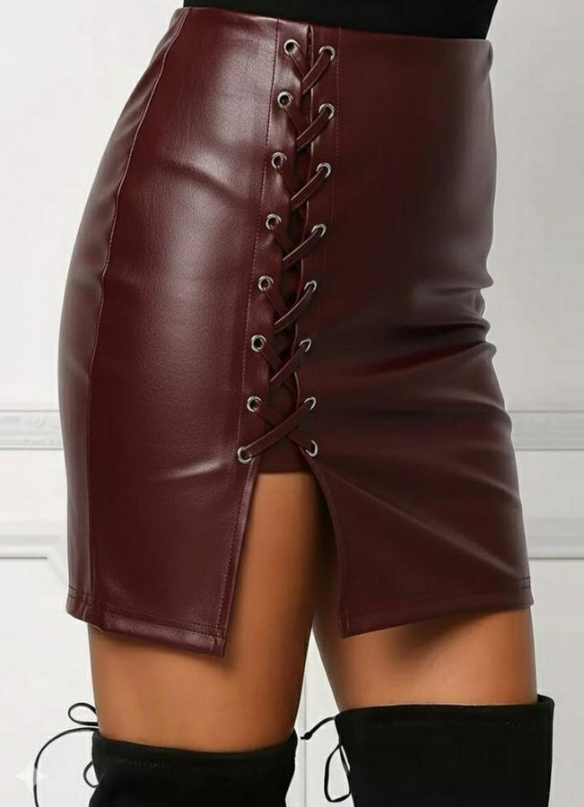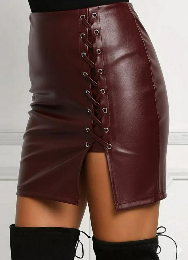 Kadın Yüksek Bel Yandan çapraz Bağcıklı Yırtmaçlı Mini Deri Etek