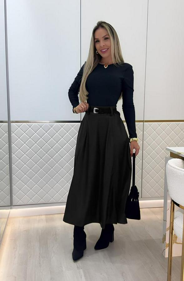 Yüksek Belli Maxi Deri Kemersiz Etek