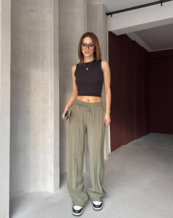 Kadın Beli Lastikli çımalı Tensel Kumaş Ispanyol Paça Pantolon