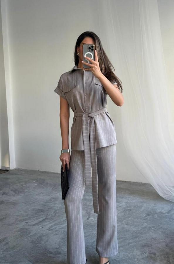 ÇİZGİLİ POLYVİSKON BLUZ - PANTOLON TAKIM - Gri