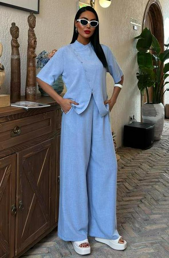 AnasayfaTüm ÜrünlerAlt GiyimPantolonHakim Yaka Çapraz Düğmeli Plazzo Pantolon Viscon Keten Takım 10091