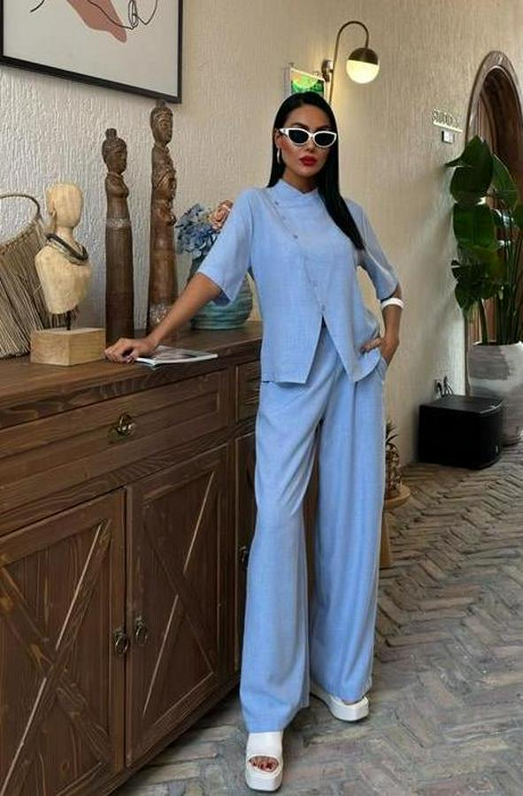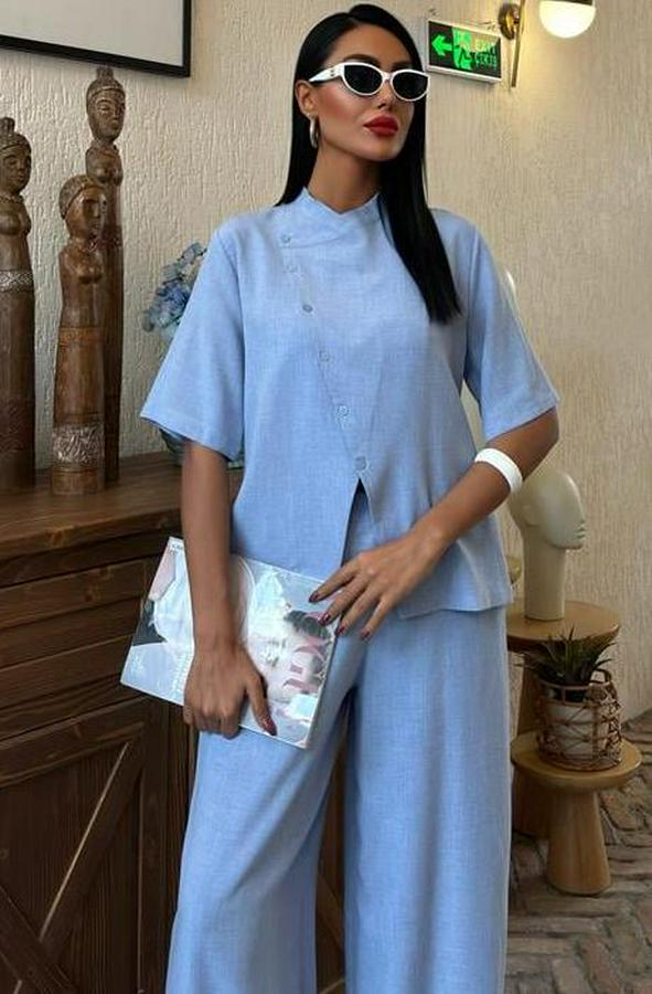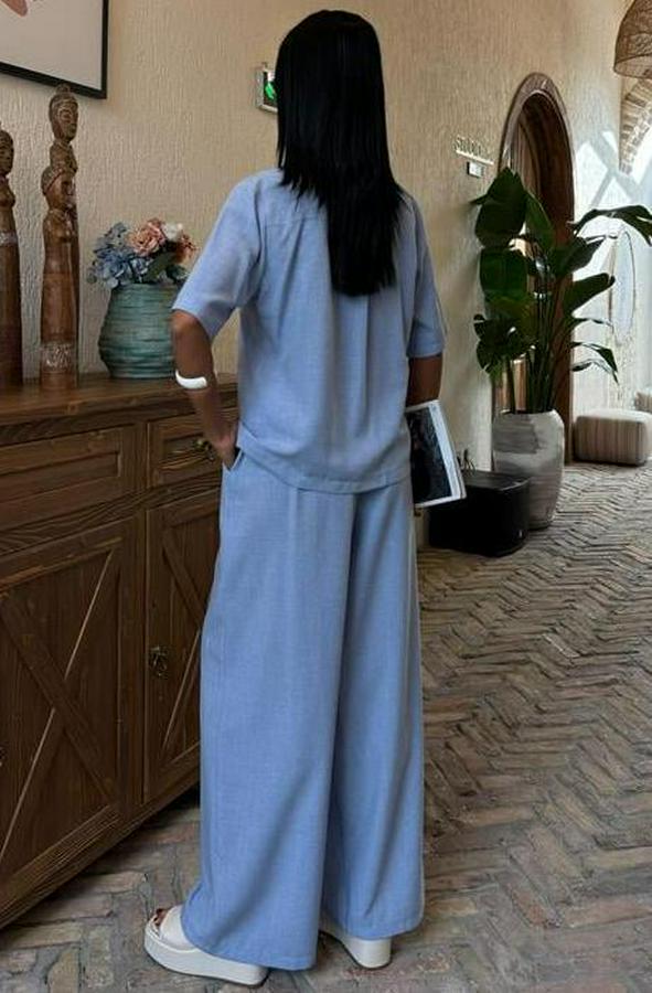 Hakim Yaka Çapraz Düğmeli Plazzo Pantolon Viscon Keten Takım 10091