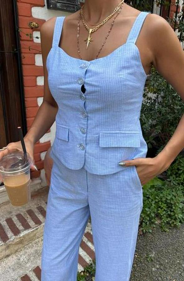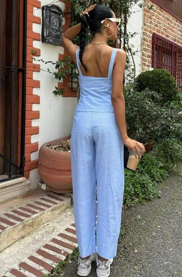 AnasayfaTüm ÜrünlerAlt GiyimPantolonKalın Askılı Bluz Pantolon Keten Takım 10187