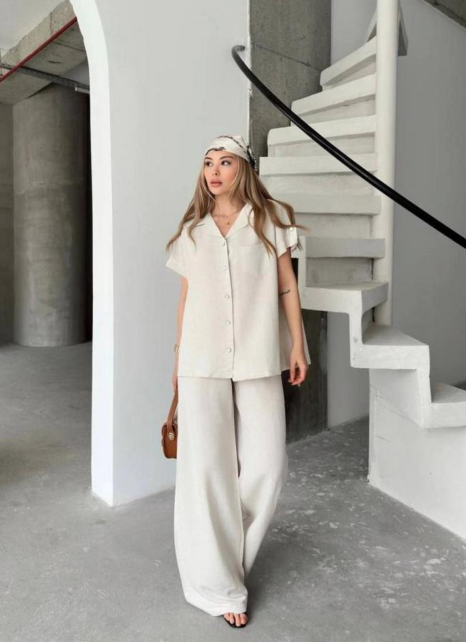 Keten Kısa Kollu Cepli Gömlek Pantolon Ikili Takım - Beyaz