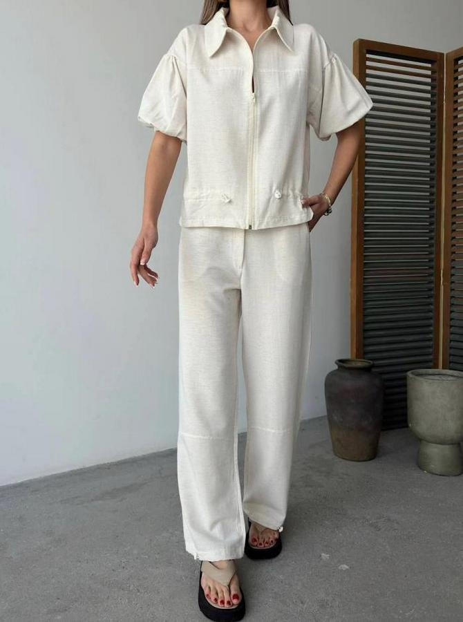Keten Tam Fermuarlı Kısa Kollu Gömlek Pantolon Ikili Takım - Beyaz