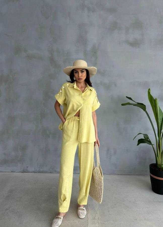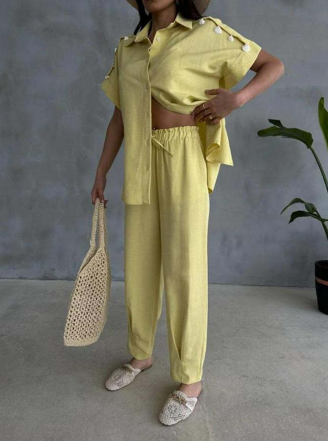 OMUZ MİDYE SIRALI BLUZ - PAÇA PENSLİ PANTOLON TAKIM - Sarı