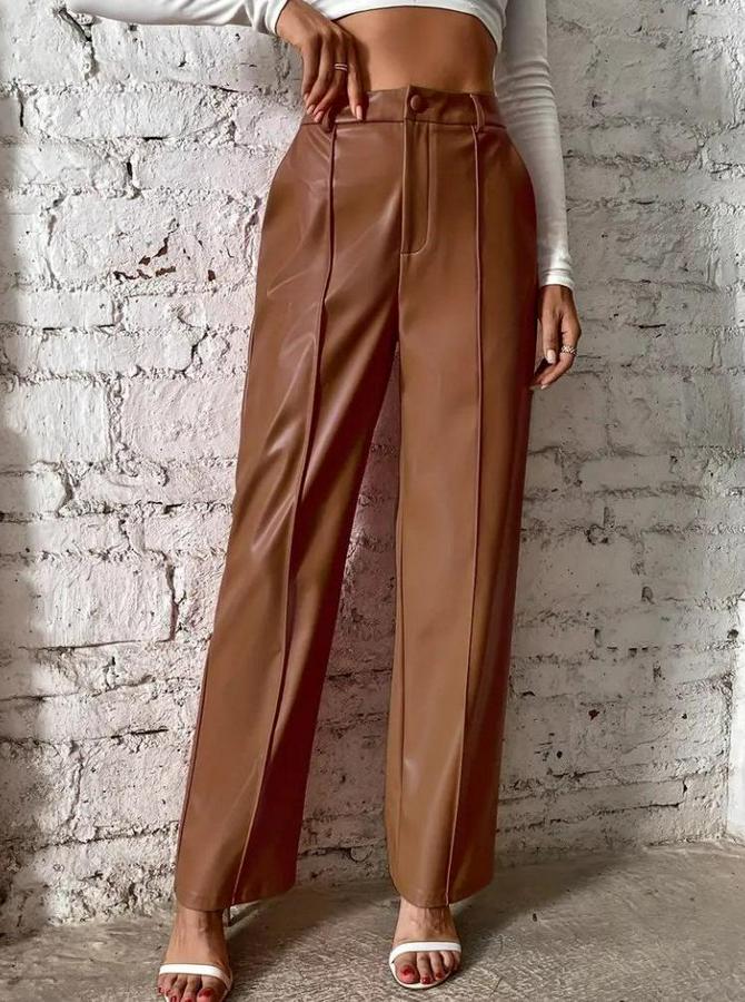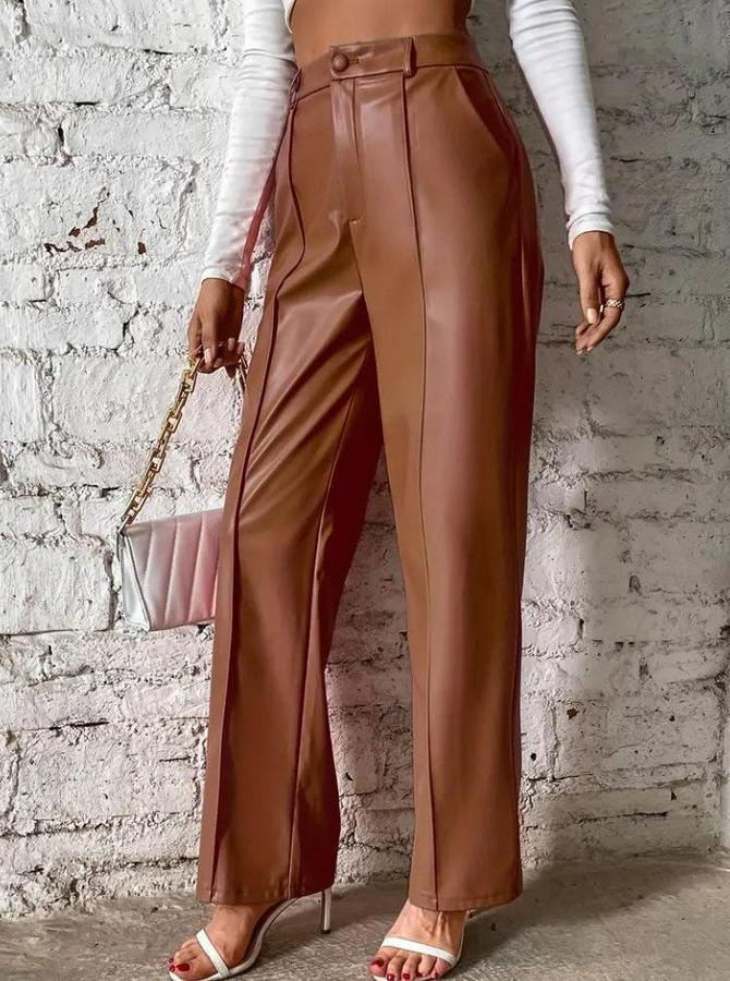 Önden Fermuarlı Cepli Geniş Kesim Lame Deri Pantolon
