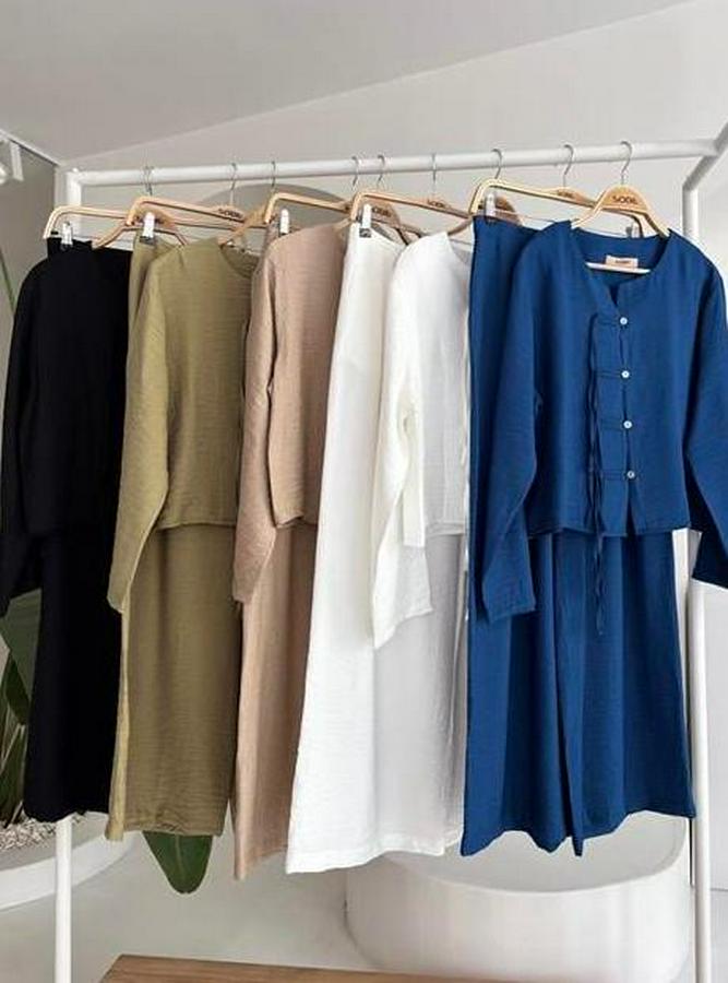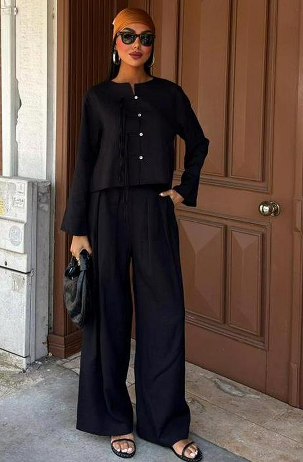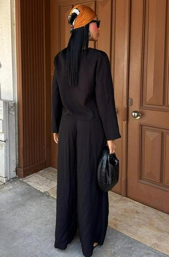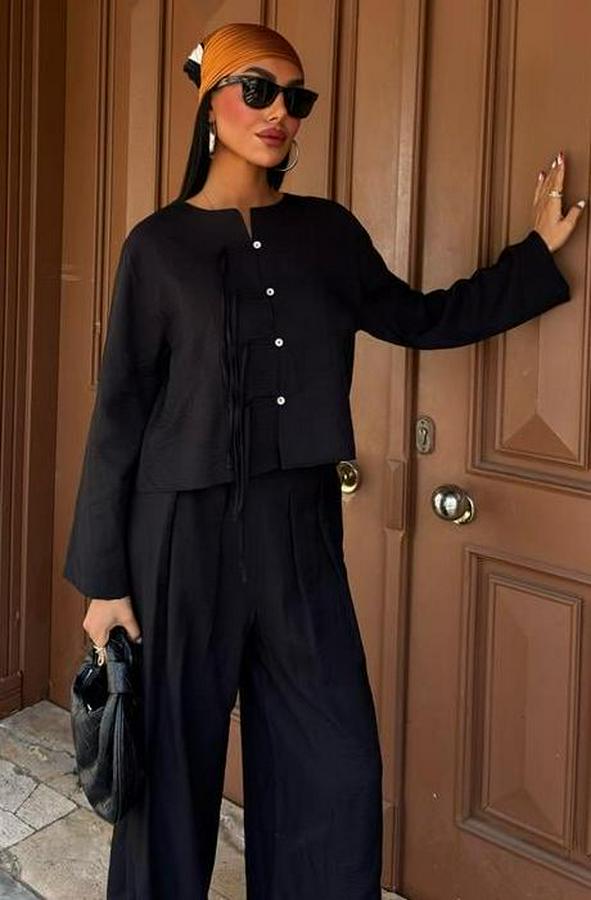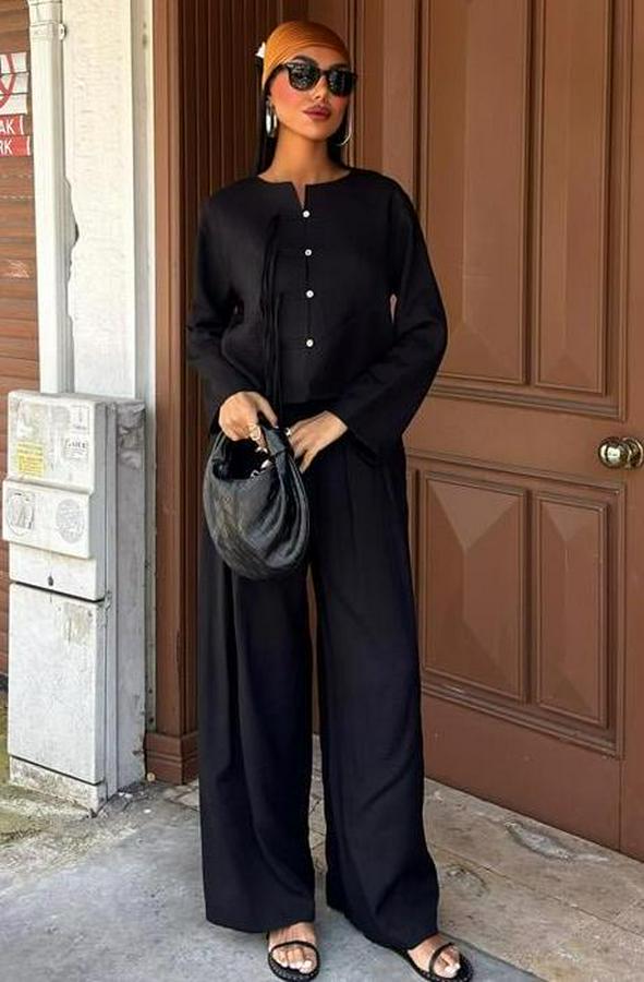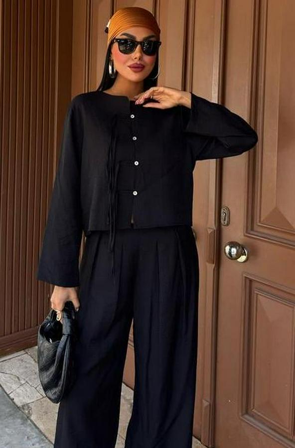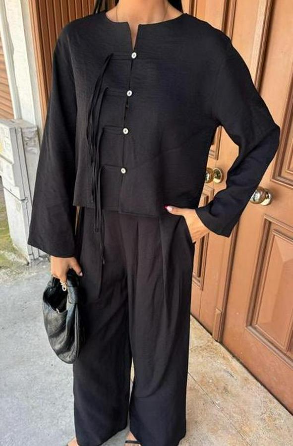 AnasayfaTüm ÜrünlerAlt GiyimPantolonÖnü Ince Kordon Detaylı Ve Double Paça Pantolonlu Takım 10180