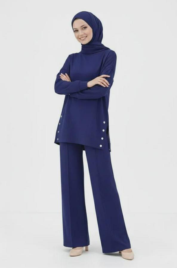 Osy Modal Yumuşak Dokulu Kumaş Modern Tesettür Takım Yandan Metal Çıtçıtlı Uzun Tunik Pantolon Set Salaş Kalıp - Lacivert