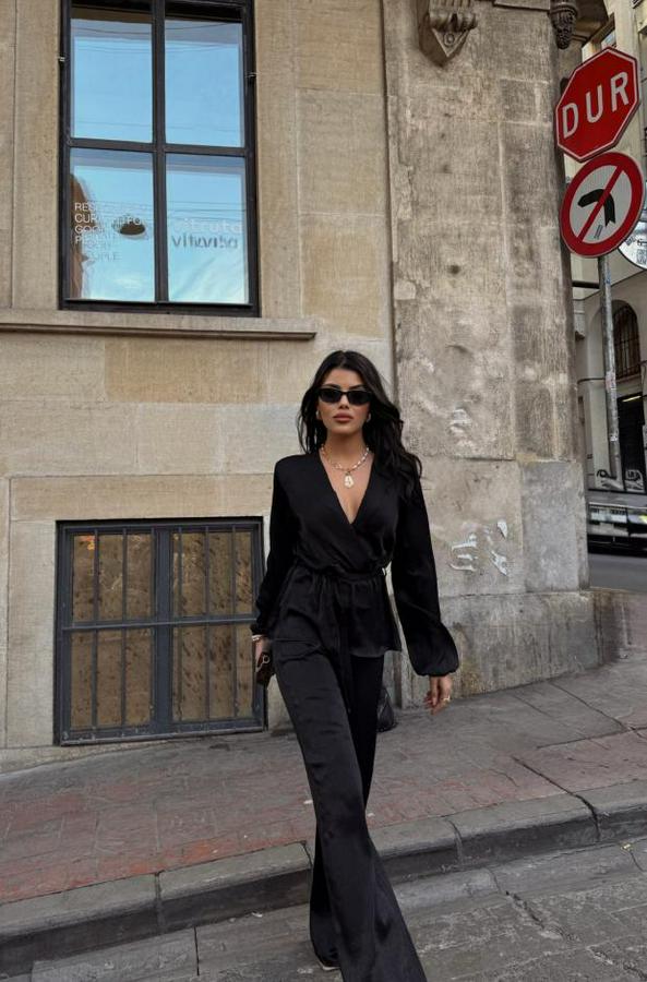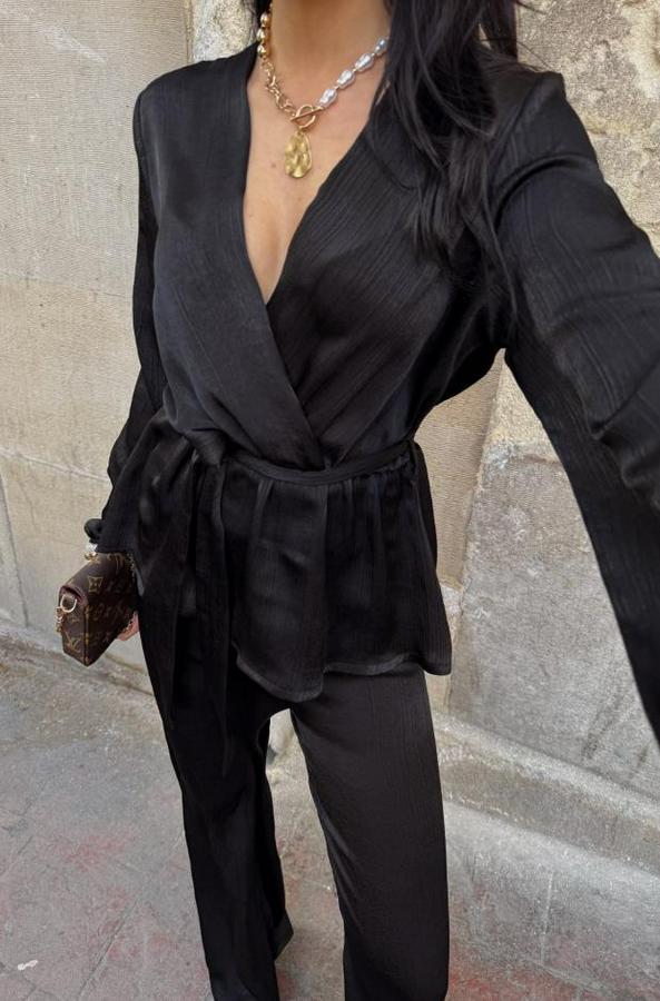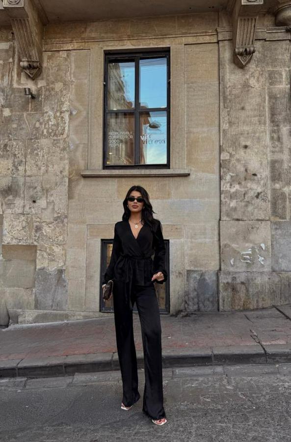 SATEN KRUVAZE BAĞLAMALI BLUZ- PANTOLON TAKIM - Siyah