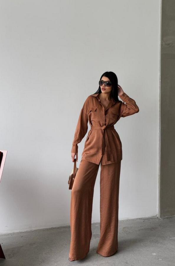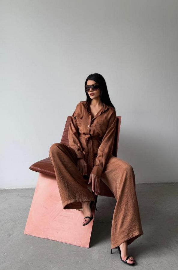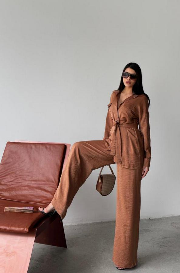 SİMLİ KUMAŞ SALAŞ PANTOLON - GÖMLEK TAKIM - Kahverengi
