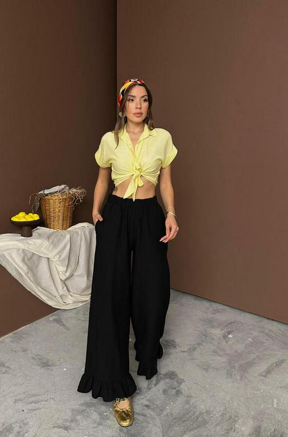 AnasayfaTüm ÜrünlerAlt GiyimPantolonSiyah Paçası Fırfırlı Keten Pantolon