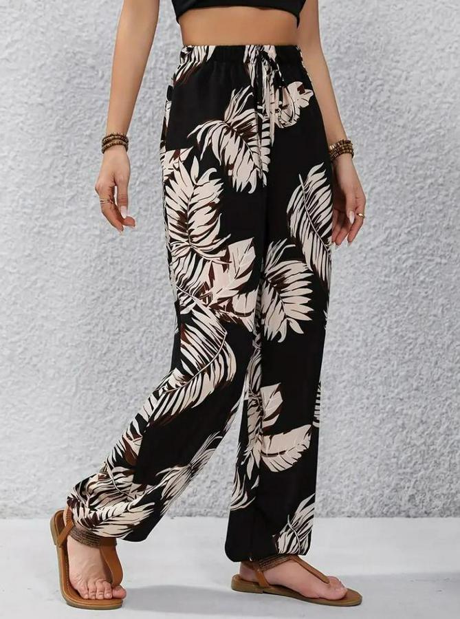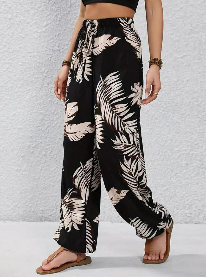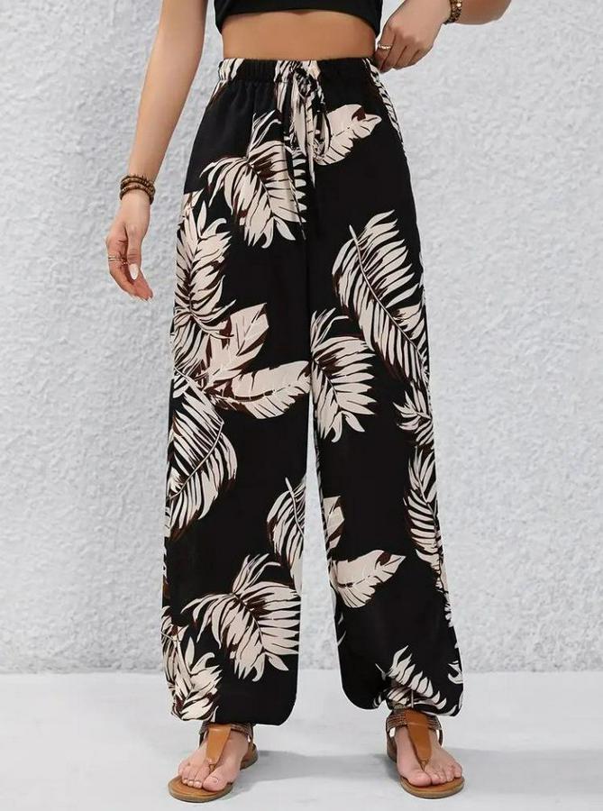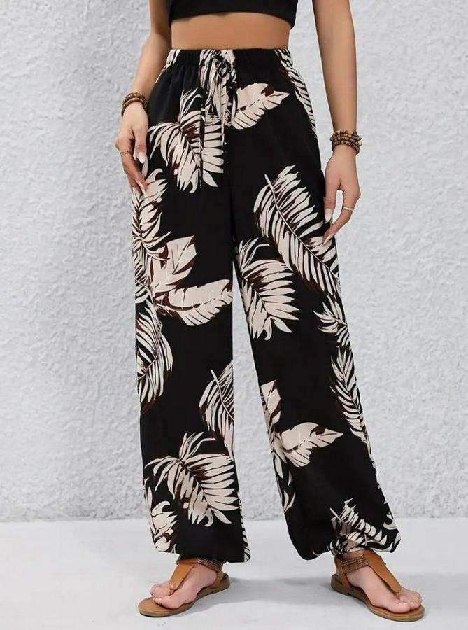 Yüksek Bel Bağcıklı Yaprak Desenli Süprem Pantolon