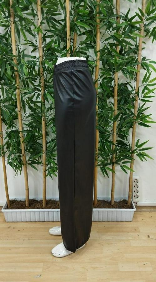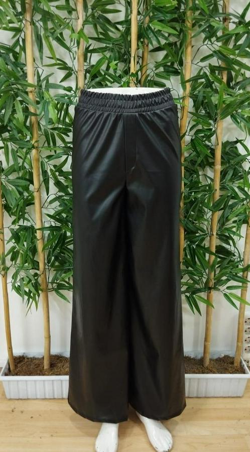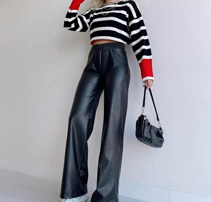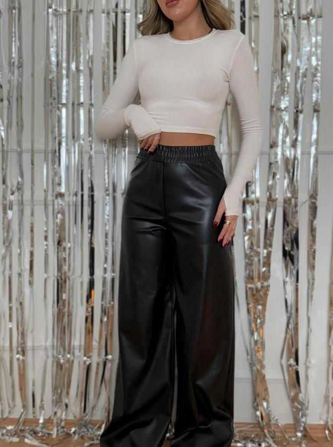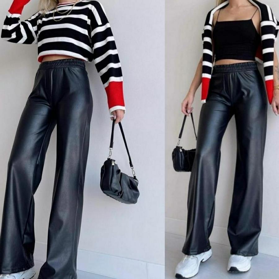 Kadın Yüksek Bel Beli Lastikli Geniş Paçalı Deri Pantolon
