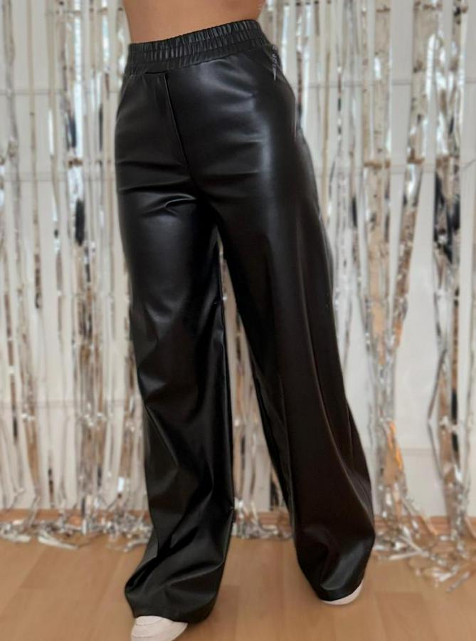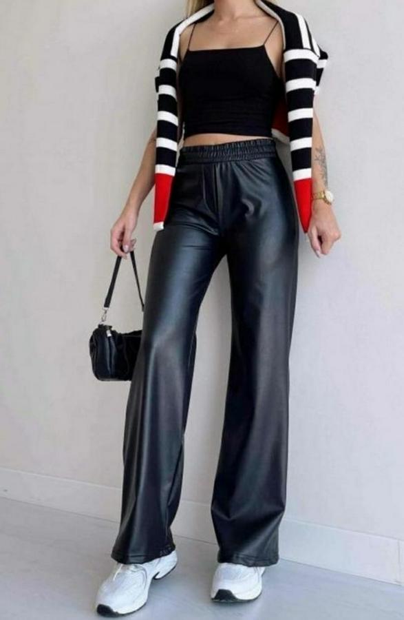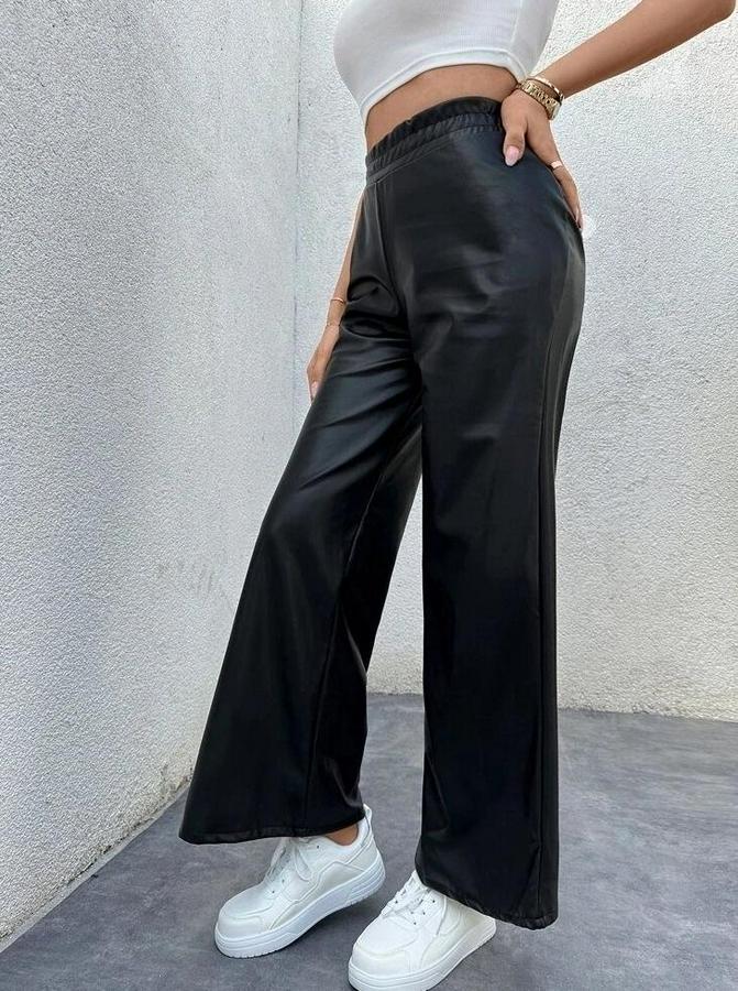 Yüksek Bel Beli Lastikli Geniş Paçalı Deri Pantolon