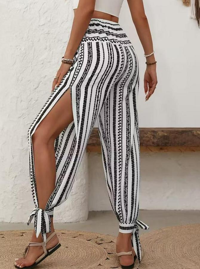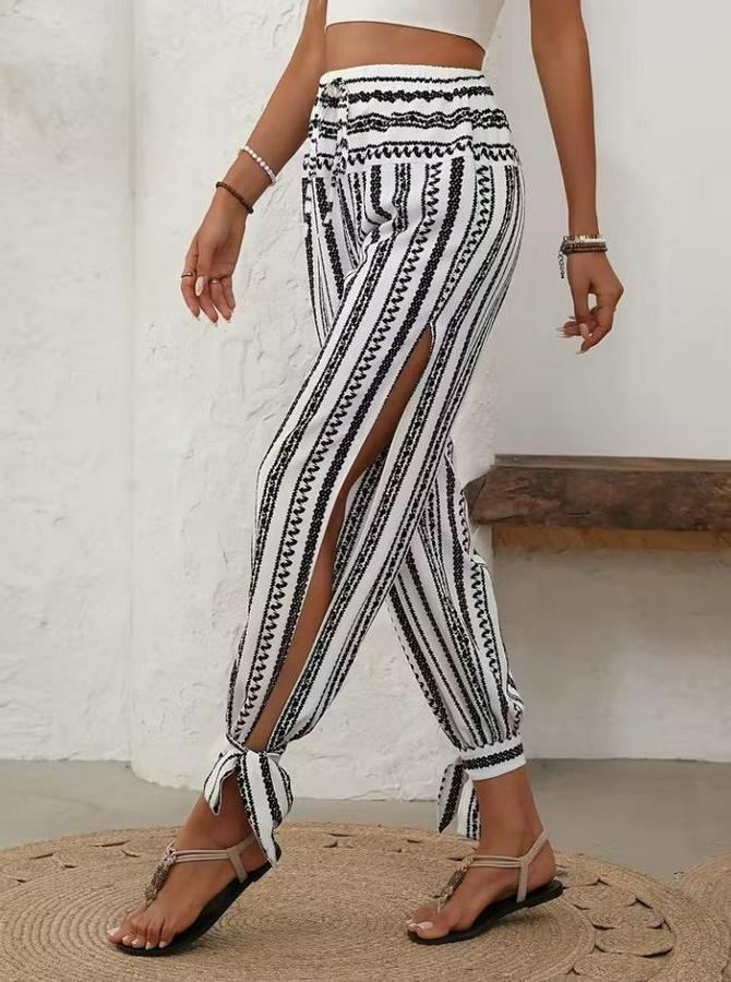 AnasayfaTüm ÜrünlerAlt GiyimPantolonYüksek Bel Desenli Paçadan Bağlamalı Yanları Yırtmaçlı Süprem Pantolon