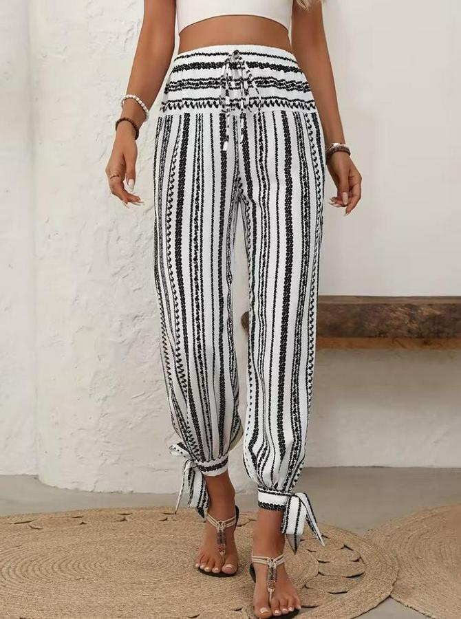 Kadın Yüksek Bel Desenli Paçadan Bağlamalı Yanları Yırtmaçlı Süprem Pantolon