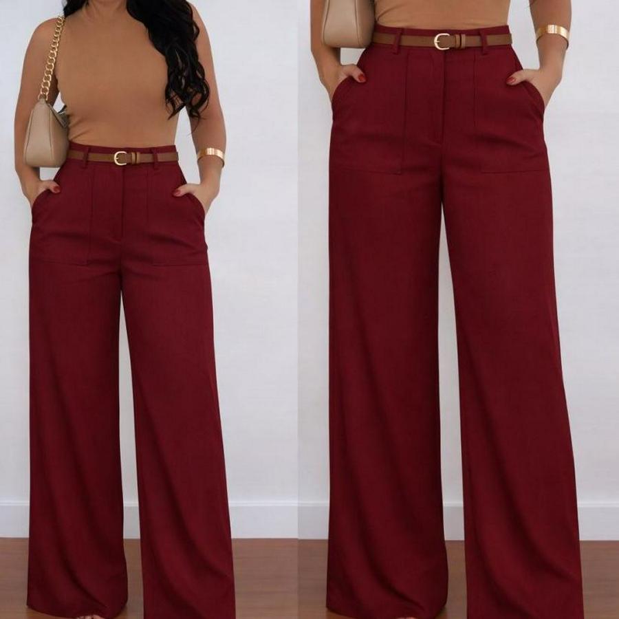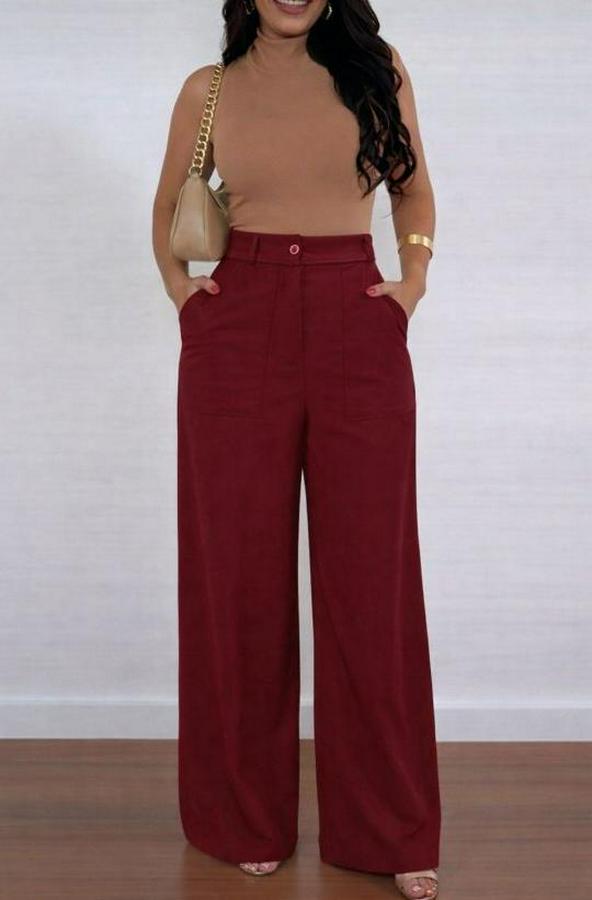 Kadın Yüksek Bel Geniş Paça Detaylı Cepli Ithal Krep Pantolon