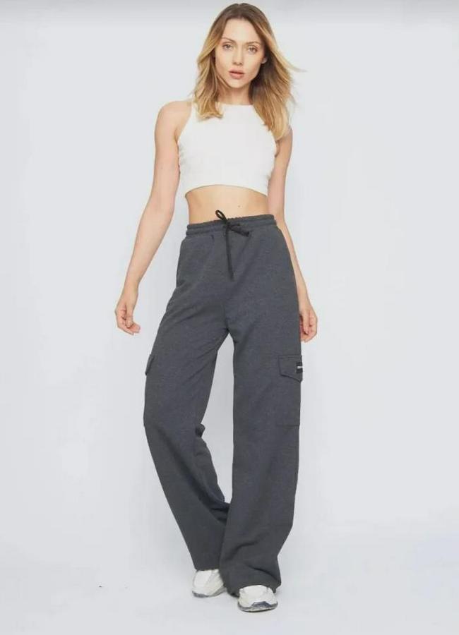 Yüksek Bel Kargo Cepli Palazzo Pantolon Oversize Bol Paça İki İplik Rahat Kesim - Antrasit