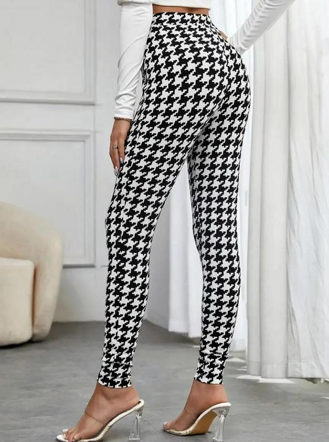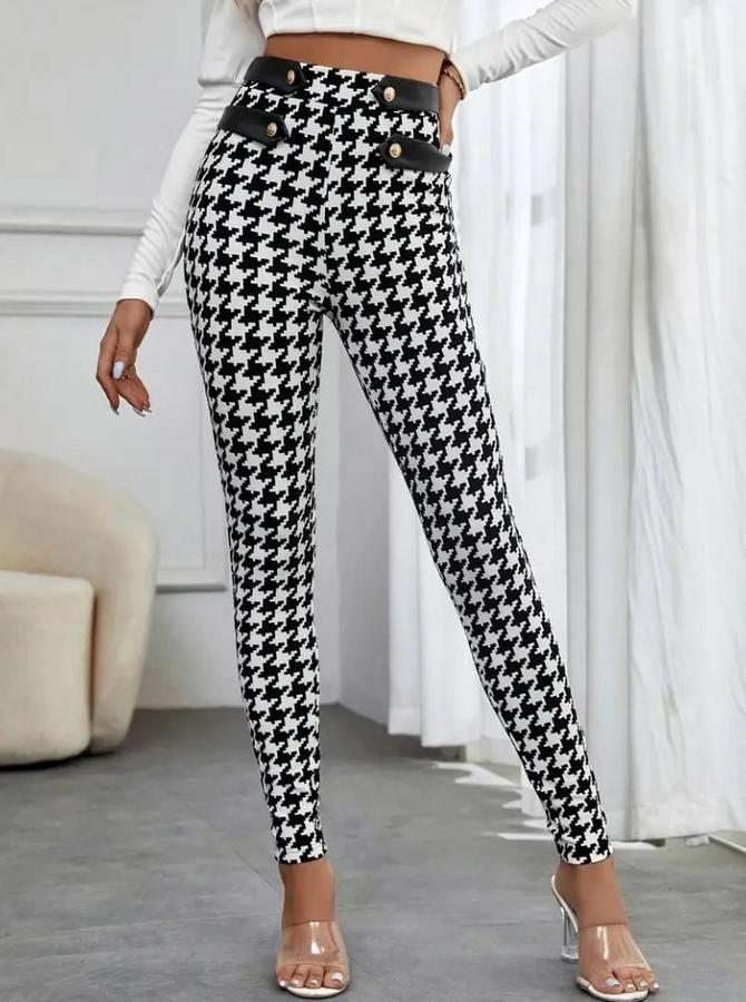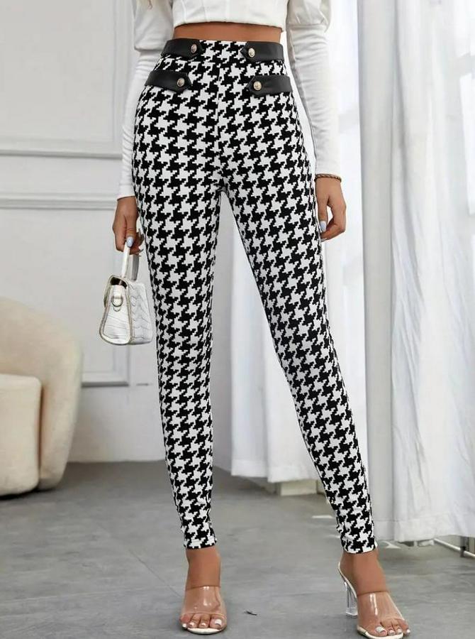 Kadın Yüksek Bel Kaz Ayağı Desenli Yan şerit Düğme Detaylı Dalgıç Pantolon