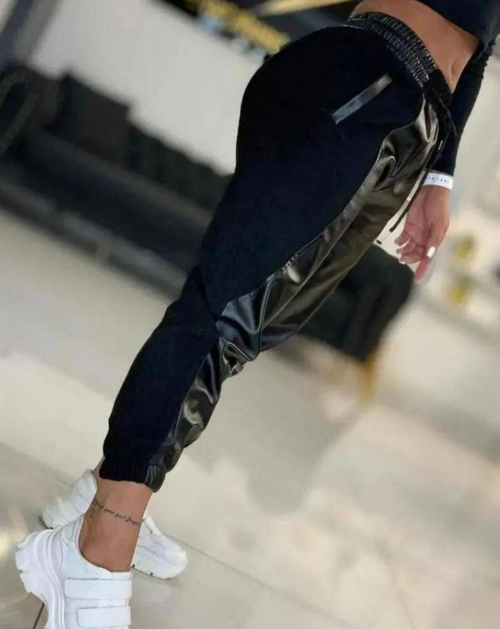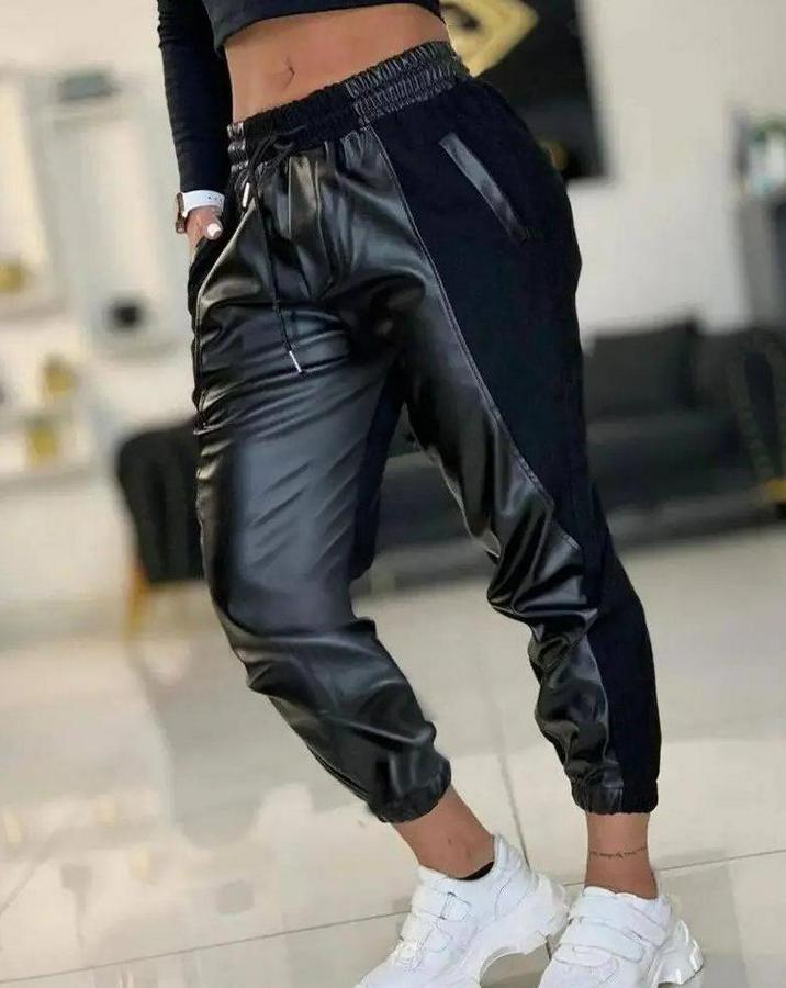 Kadın Yüksek Bel Lastikli Cepli Deri Detaylı Dalgıç Pantolon
