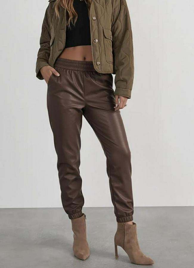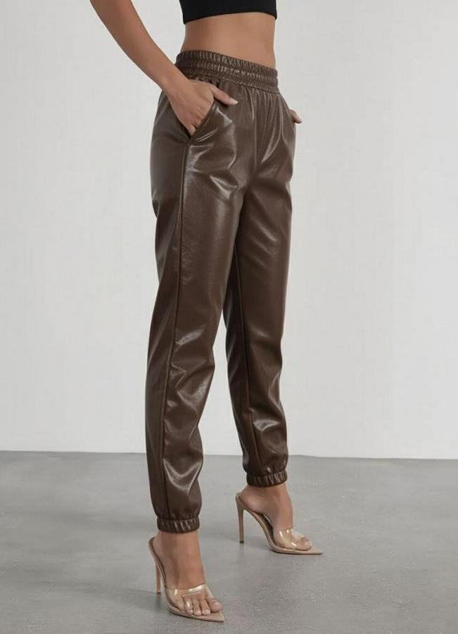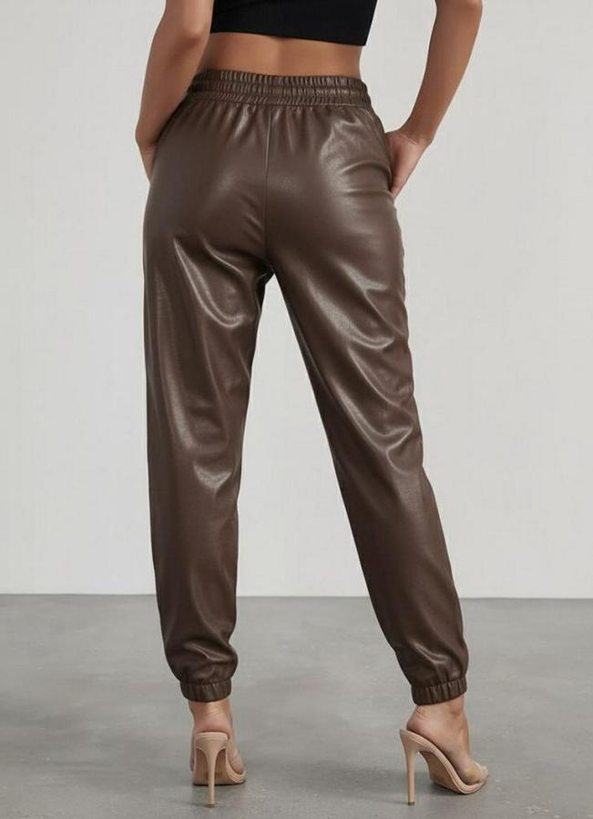 Yüksek Bel Lastikli Önü Düğmeli Deri Pantolon