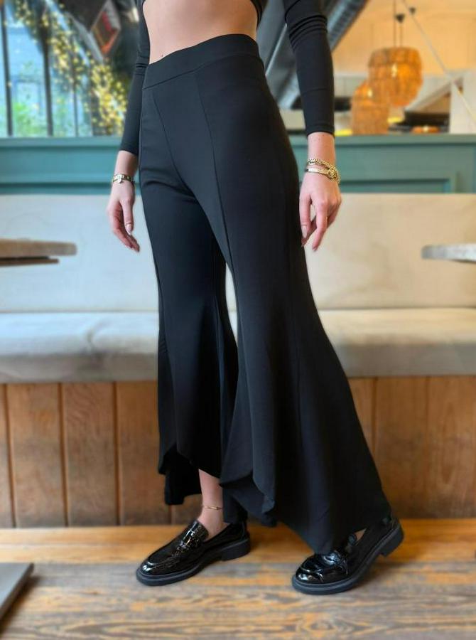 Yüksek Bel Önden Arkaya Uzanan Volanlı Paçalı Janjan Krep Pantolon