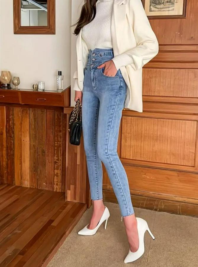 Yüksek Bel Önden Düğmeli Cepli Dar Kesim Detaylı Kot Pantolon
