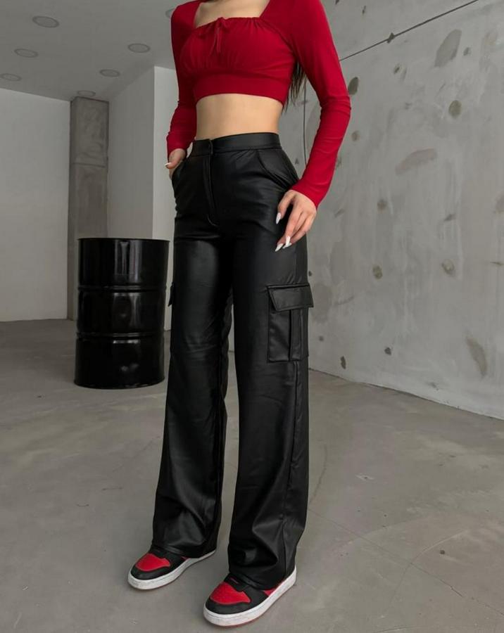 Kadın Yüksek Bel önden Fermuarlı Yandan Cep Detaylı Deri Kargo Pantolon