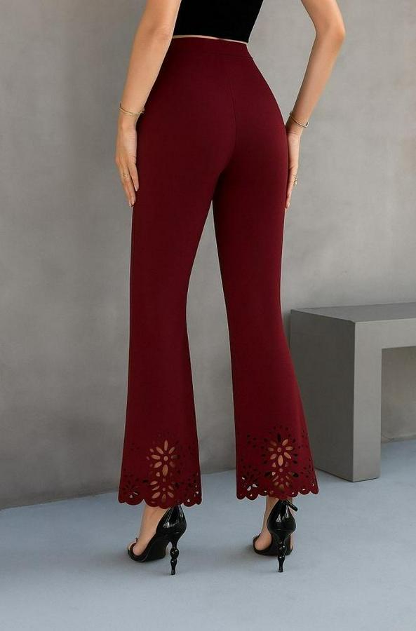 Yüksek Bel Paçaya Doğru Genişleyen Lazer Çiçek Kesim Detaylı Ithal Krep Pantolon