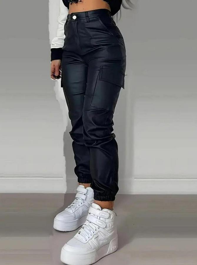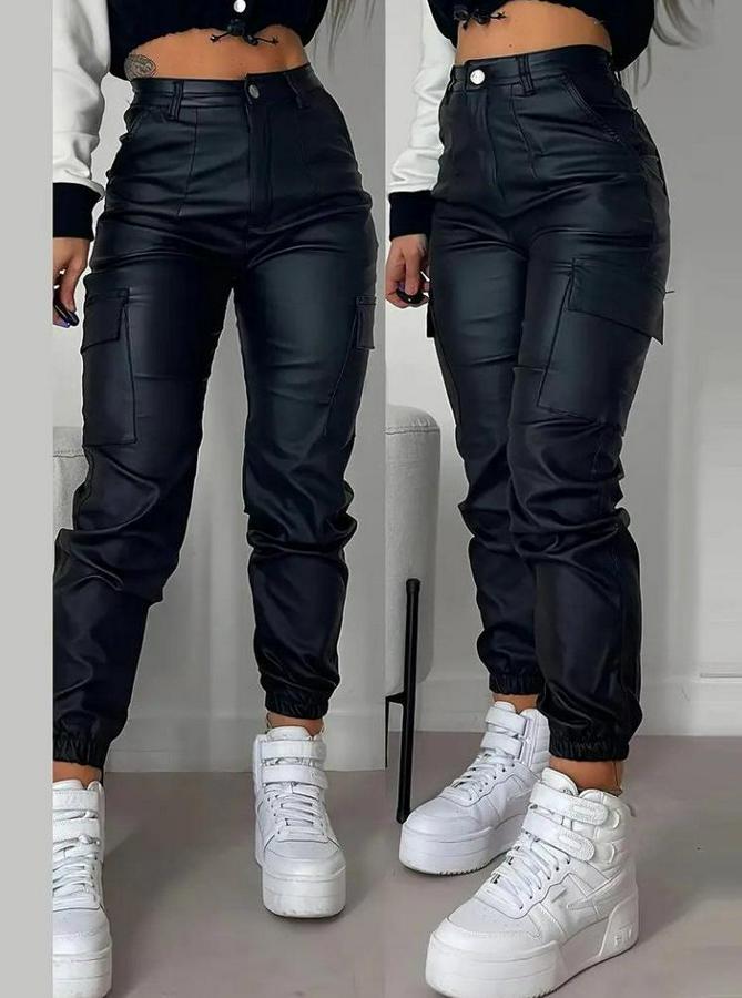 Yüksek Bel Yan Kargo Cep Detaylı Deri Pantolon