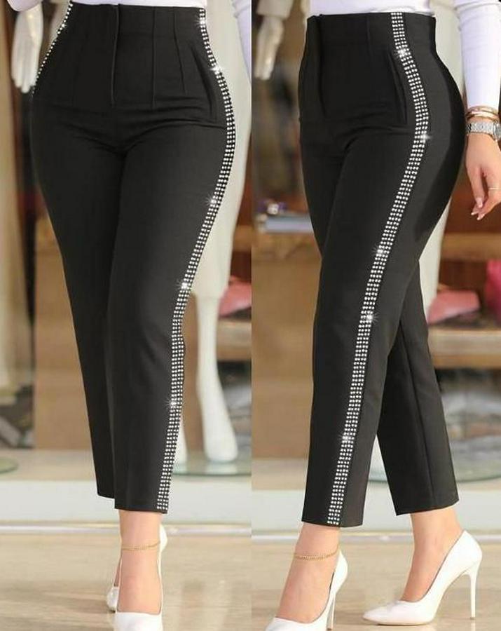 Kadın Yüksek Bel Yanlardan Taş Detaylı Ithal Krep Pantolon