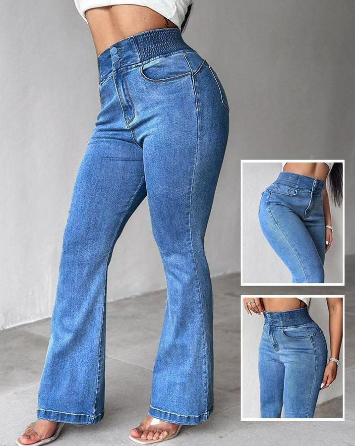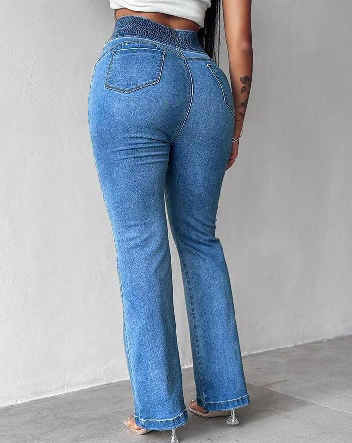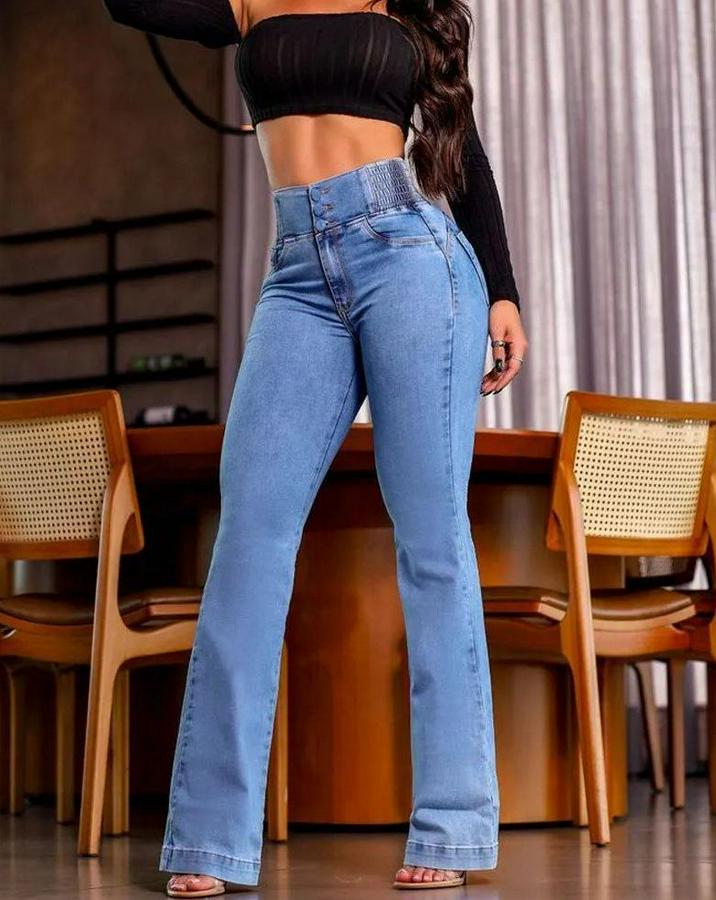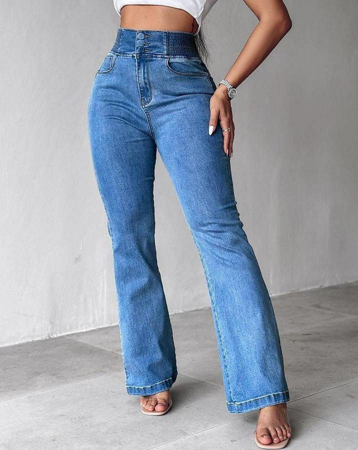 Yüksek Bel Yanları Lastik Önü Düğmeli Kot Pantolon