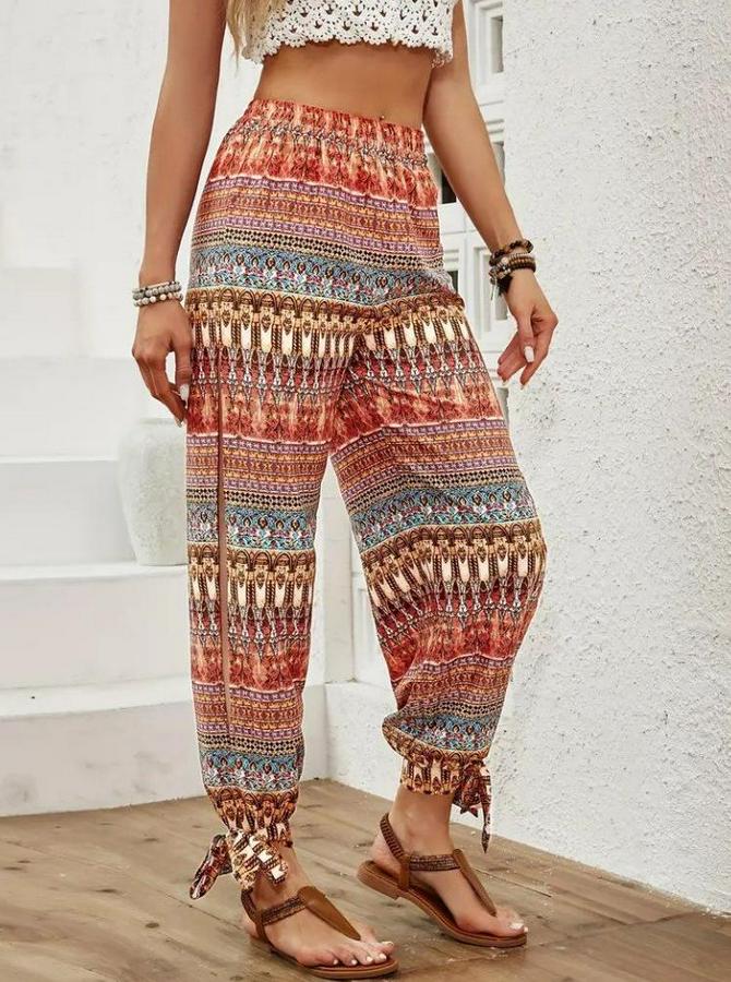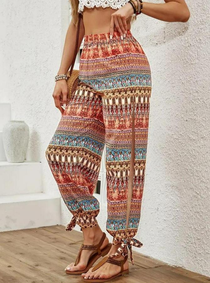Kadın Yüksek Belli Yanlardan Yırtmaç Detaylı Desenli Bürümcük Pantolon
