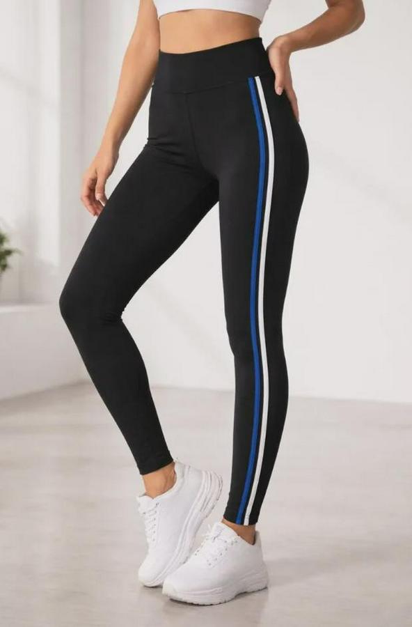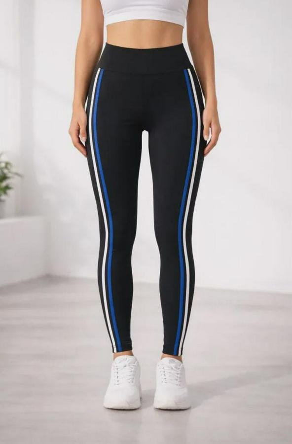 Likralı Yan Beyaz Mavi Şeritli Detaylı Tayt - Siyah